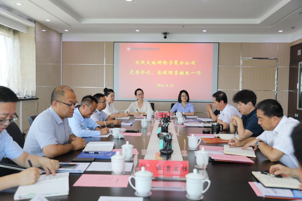 2024年6月25日,集團(tuán)公司黨委書(shū)記、董事長(zhǎng)楊舵與來(lái)訪的大地財(cái)險(xiǎn)寧夏分公司黨委書(shū)記、總經(jīng)理李繼生一行座談,雙方就業(yè)務(wù)合作進(jìn)行了深入交流,集團(tuán)公司黨委副書(shū)記、工會(huì)主席郭聿維、高級(jí)經(jīng)理張宗文、大地財(cái)險(xiǎn)寧夏分公司副總經(jīng)理宋軍參加座談。